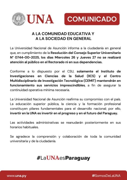 A LA COMUNIDAD EDUCATIVA Y A LA SOCIEDAD EN GENERAL La Universidad Nacional de Asunción informa a la ciudadanía en general que, en cumplimiento de