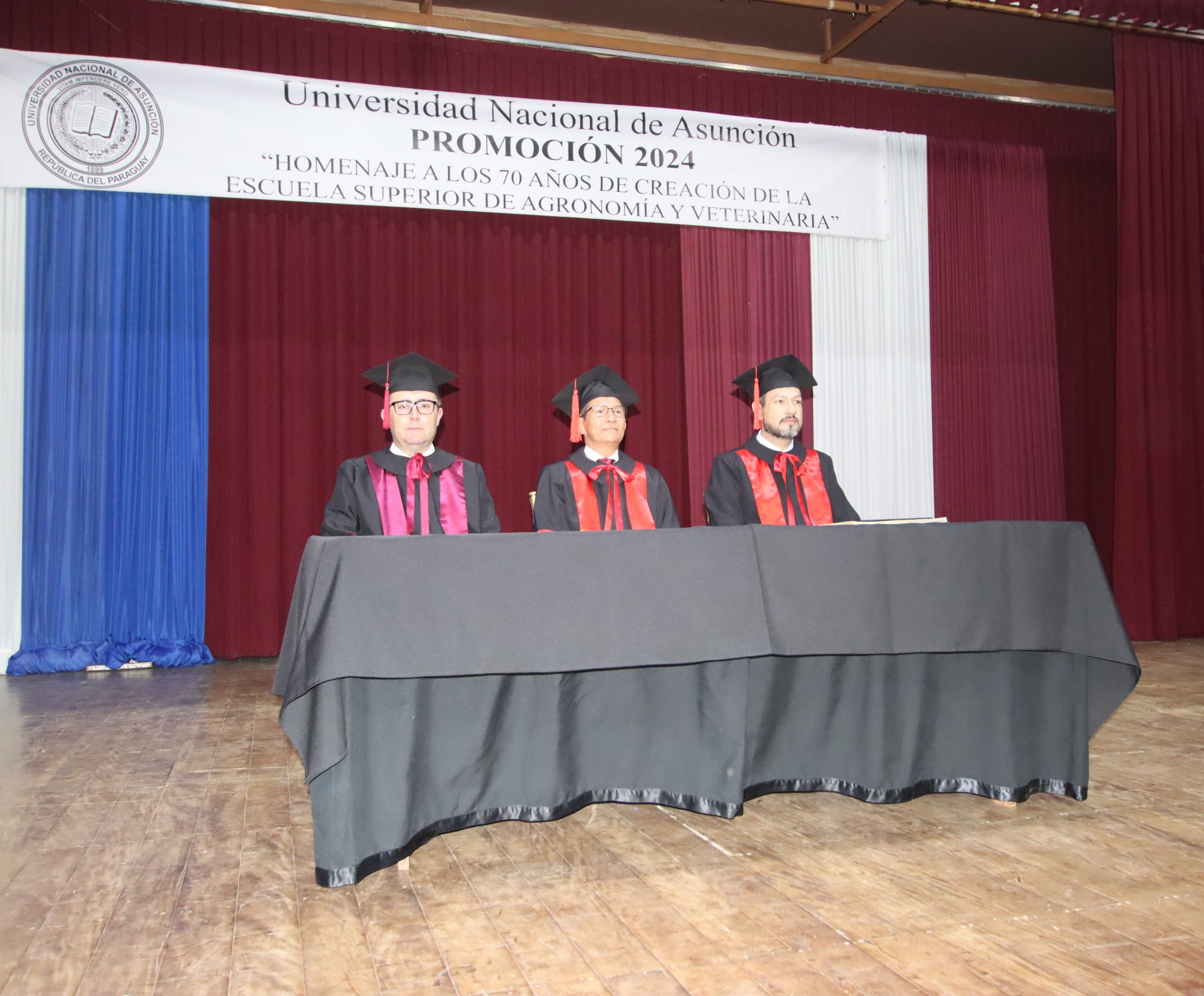 La mesa de honor de la promoción 2024, denominada “Homenaje a los 70 años de creación de la Escuela Superior de Agronomía y Veterinaria”, estuvo presidida por el Prof. Dr. Miguel Torres Ñumbay, vicerrector-rector en ejercicio de la UNA; acompañado del Prof. Dr. José Ramón Peralta, vicedecano-decano en ejercicio de la FCV-UNA y el Ing. Quím. Cristian Cantero, secretario general de la UNA.