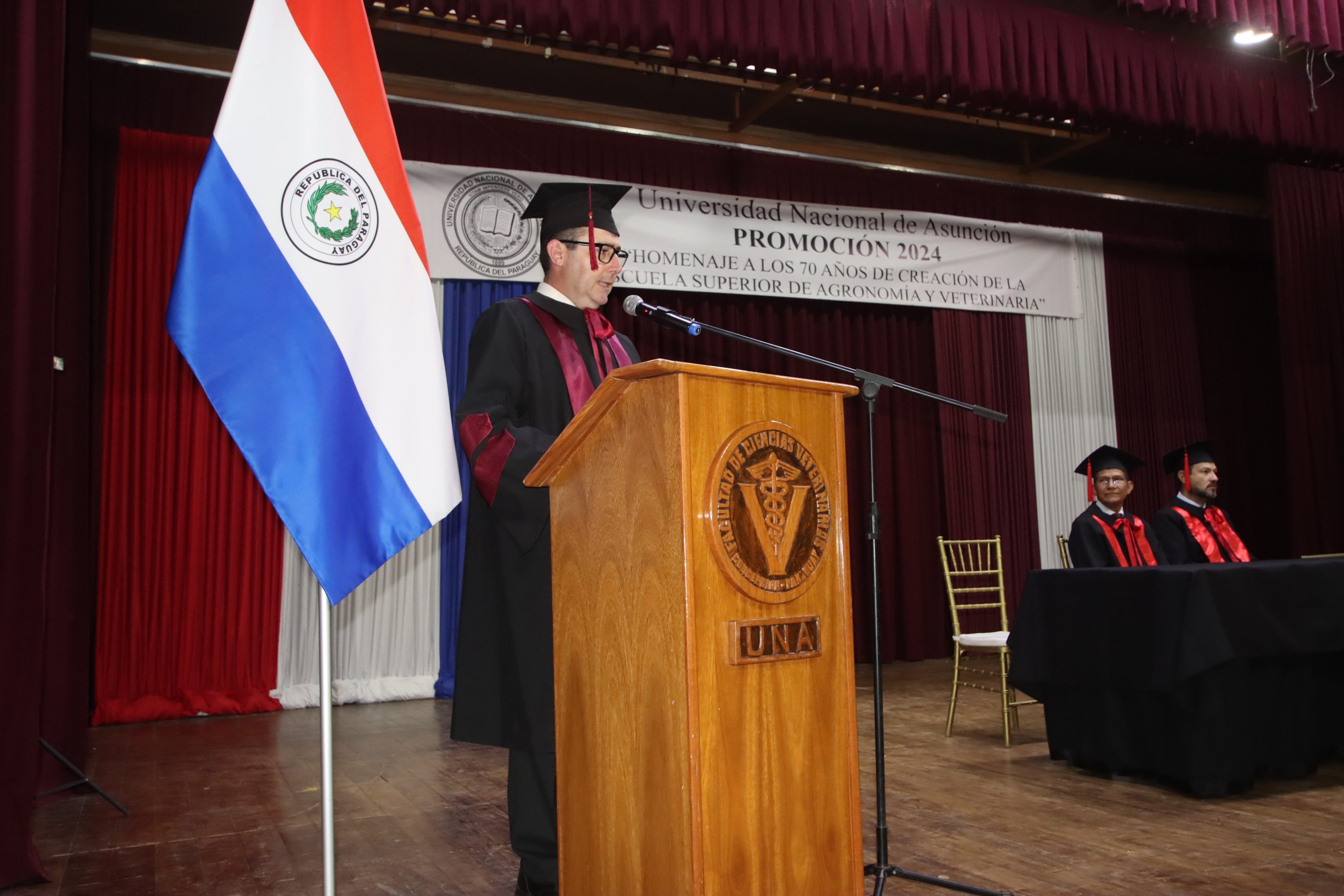 El vicedecano celebró la culminación de los estudios de las y los nuevos profesionales en ciencias veterinarias. Resaltó el rol esencial de la profesión en la salud pública, el bienestar animal y el desarrollo sostenible de las comunidades. Subrayó la responsabilidad de garantizar la salud y el cuidado de animales de producción y compañía. Agradeció al plantel académico y administrativo por su compromiso y trabajo conjunto. Finalmente, alentó a las y los profesionales a mantenerse unidos y dejar huella en la profesión.