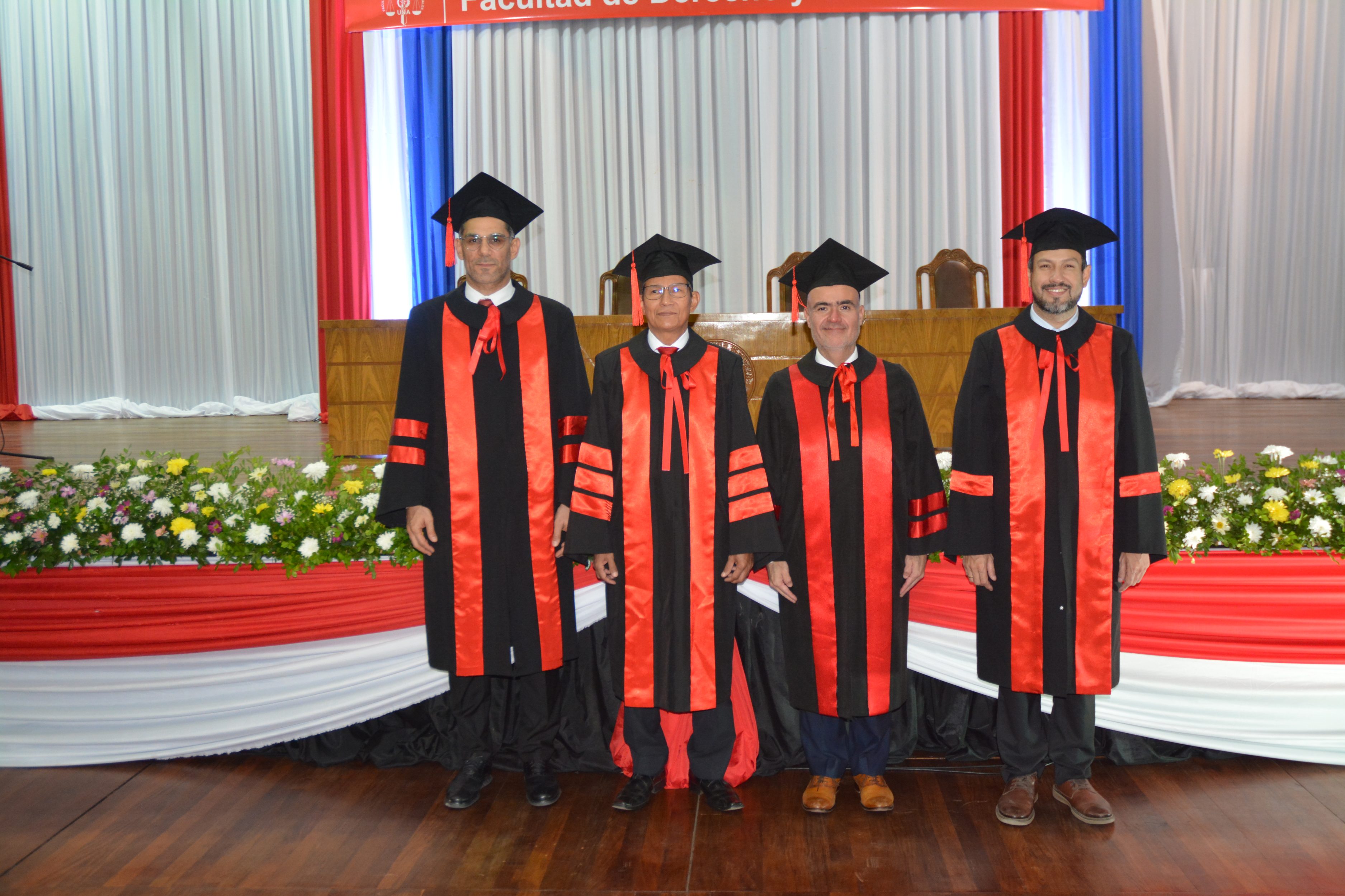 La mesa de honor de la promoción 2024, denominada “Homenaje a los 70 años de creación de la Escuela Superior de Agronomía y Veterinaria”, estuvo presidida por el Prof. Dr. Miguel Torres Ñumbay, vicerrector de la UNA, acompañado por el Prof. Dr. Carlos Gustavo González Morel, decano de la FDCS-UNA; el Prof. Dr. Marco Aurelio González Maldonado, vicedecano; y el Ing. Quím. Cristian Cantero, secretario general de la UNA.