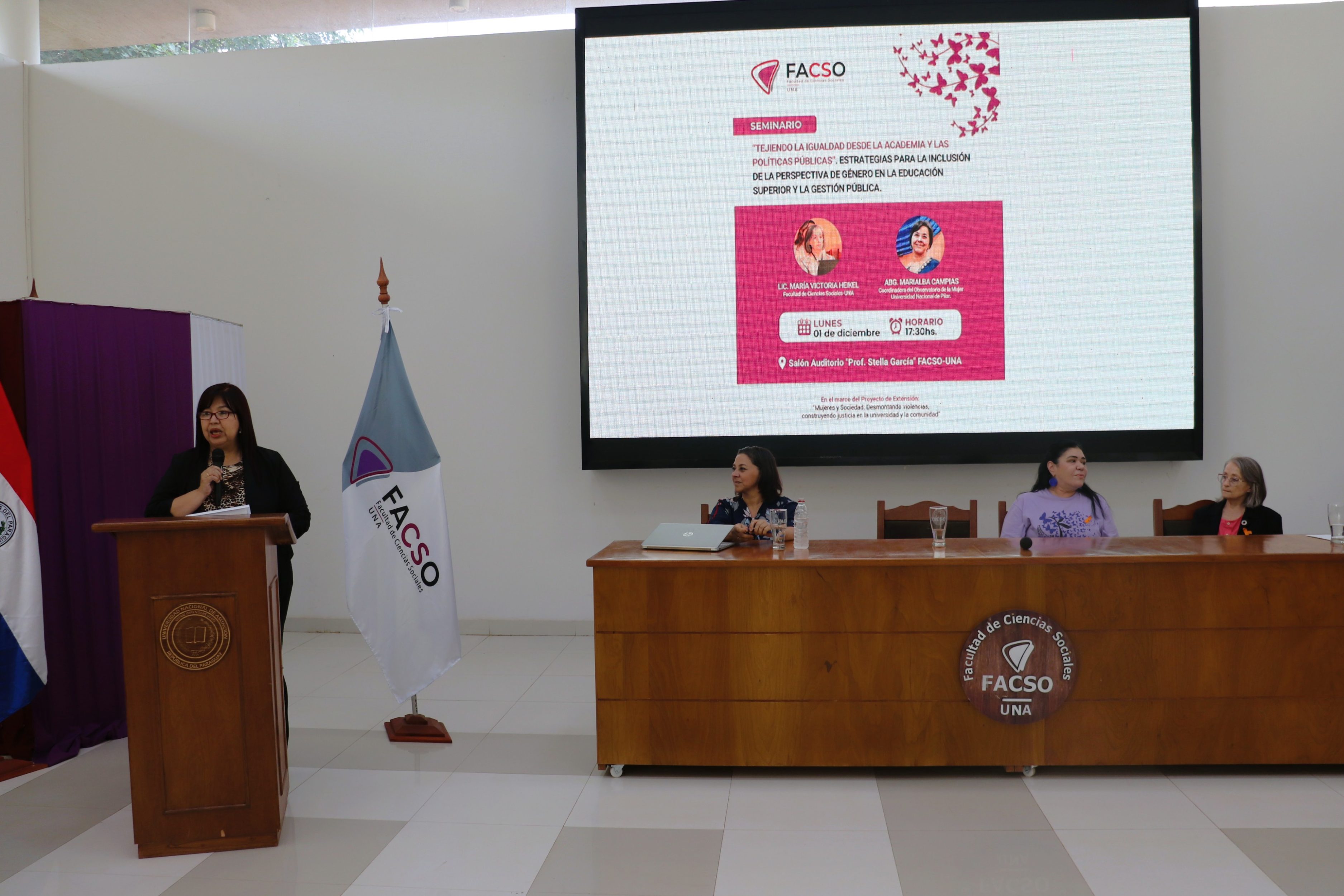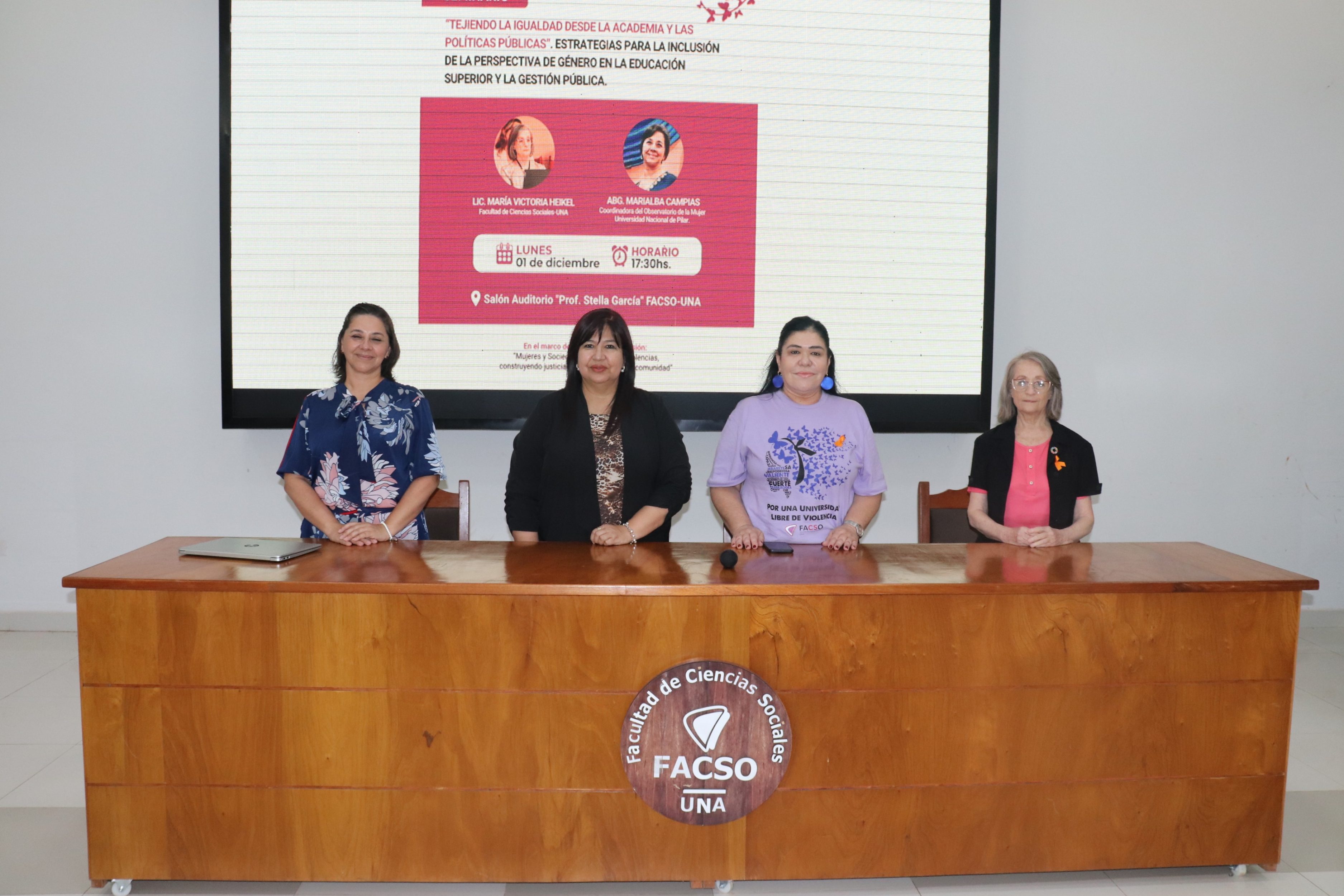 La Facultad de Ciencias Sociales de la Universidad Nacional de Asunción (FACSO-UNA) llevó a cabo, el lunes 1 de diciembre, el seminario “Tejiendo la Igualdad desde la Academia y las Políticas Públicas: Estrategias para la Inclusión de la Perspectiva de Género en la Educación Superior y la Gestión Pública”, en el marco de la conmemoración del #25N, por el Día Internacional para la Eliminación de la Violencia contra las Mujeres.