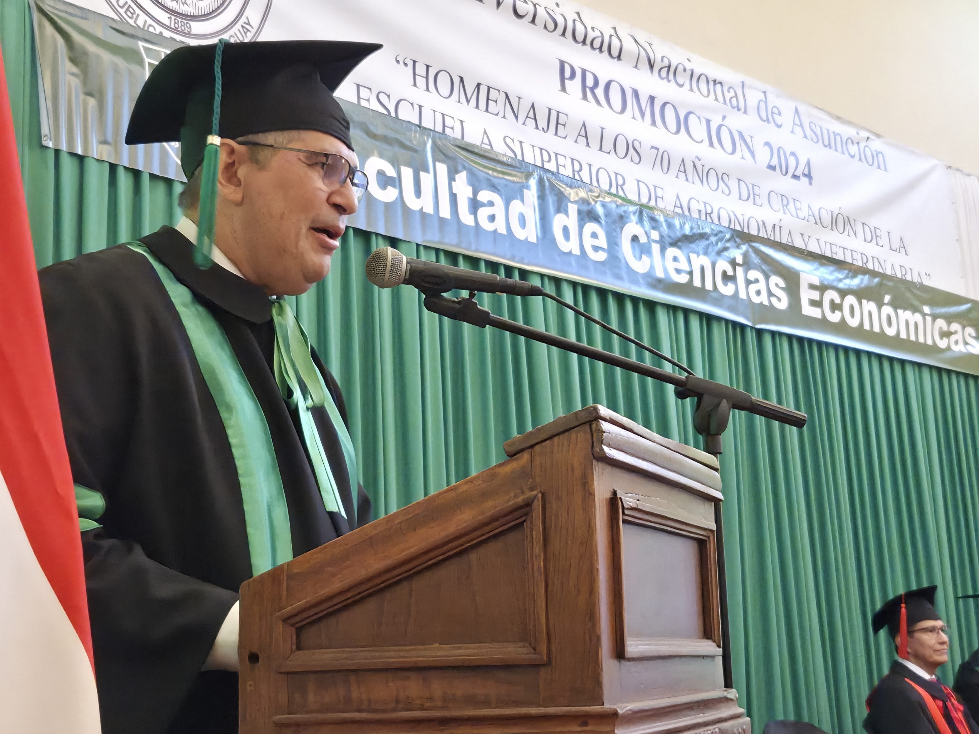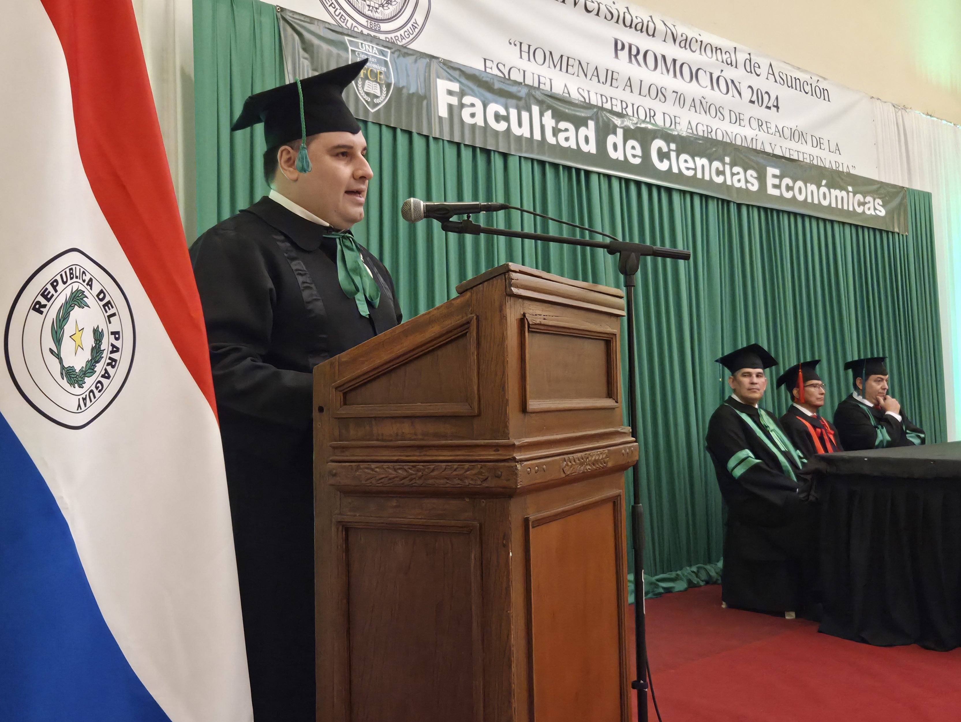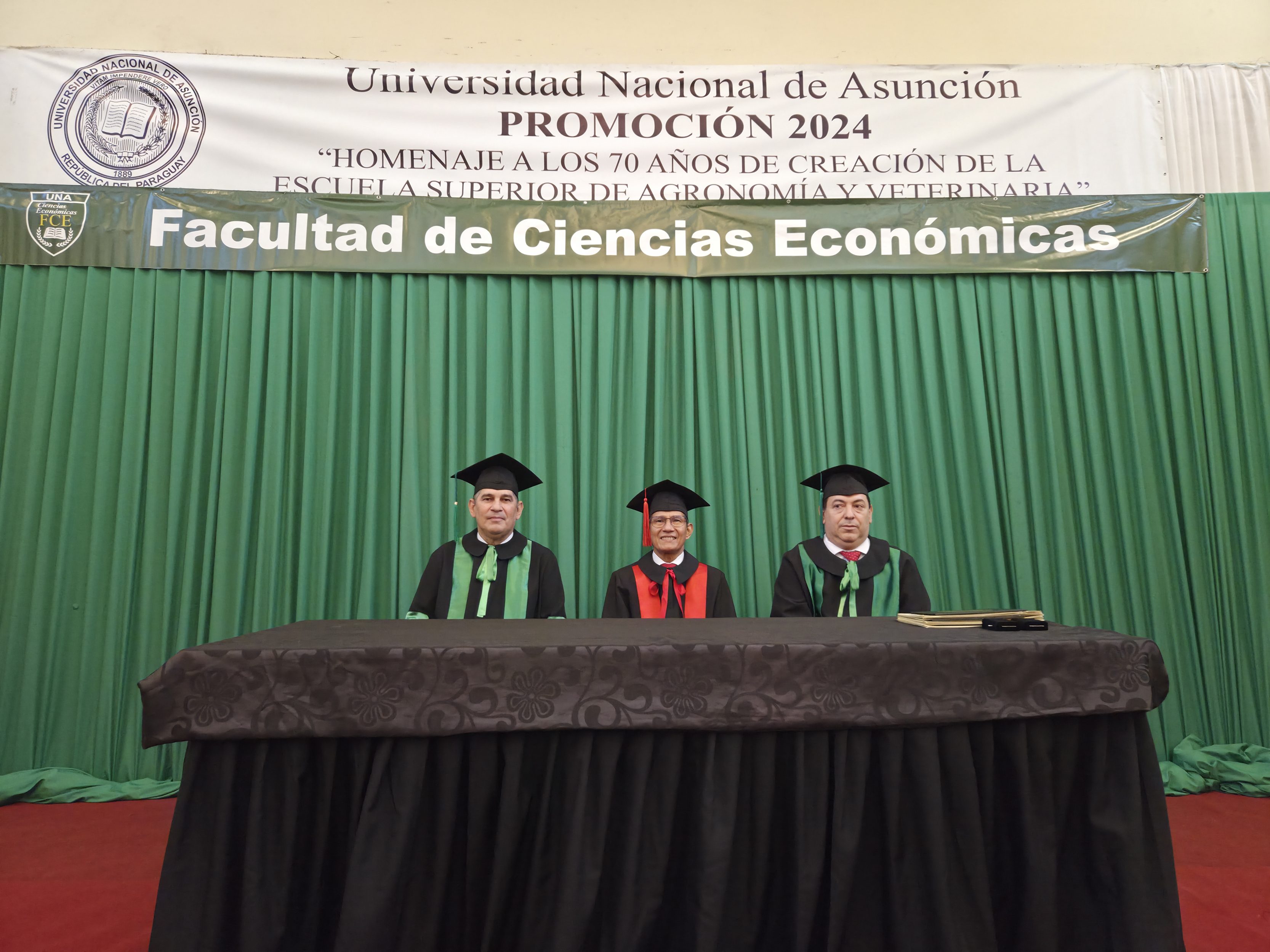 La mesa de honor de la promoción 2024, denominada “Homenaje a los 70 años de creación de la Escuela Superior de Agronomía y Veterinaria”, estuvo presidida por el Prof. Dr. Miguel Torres Ñumbay, vicerrector de la UNA, acompañado por el Prof. Dr. Roberti Daniel González, decano de la FCE-UNA y el Prof. Mag. Derlis Daniel Lugo, vicedecano.