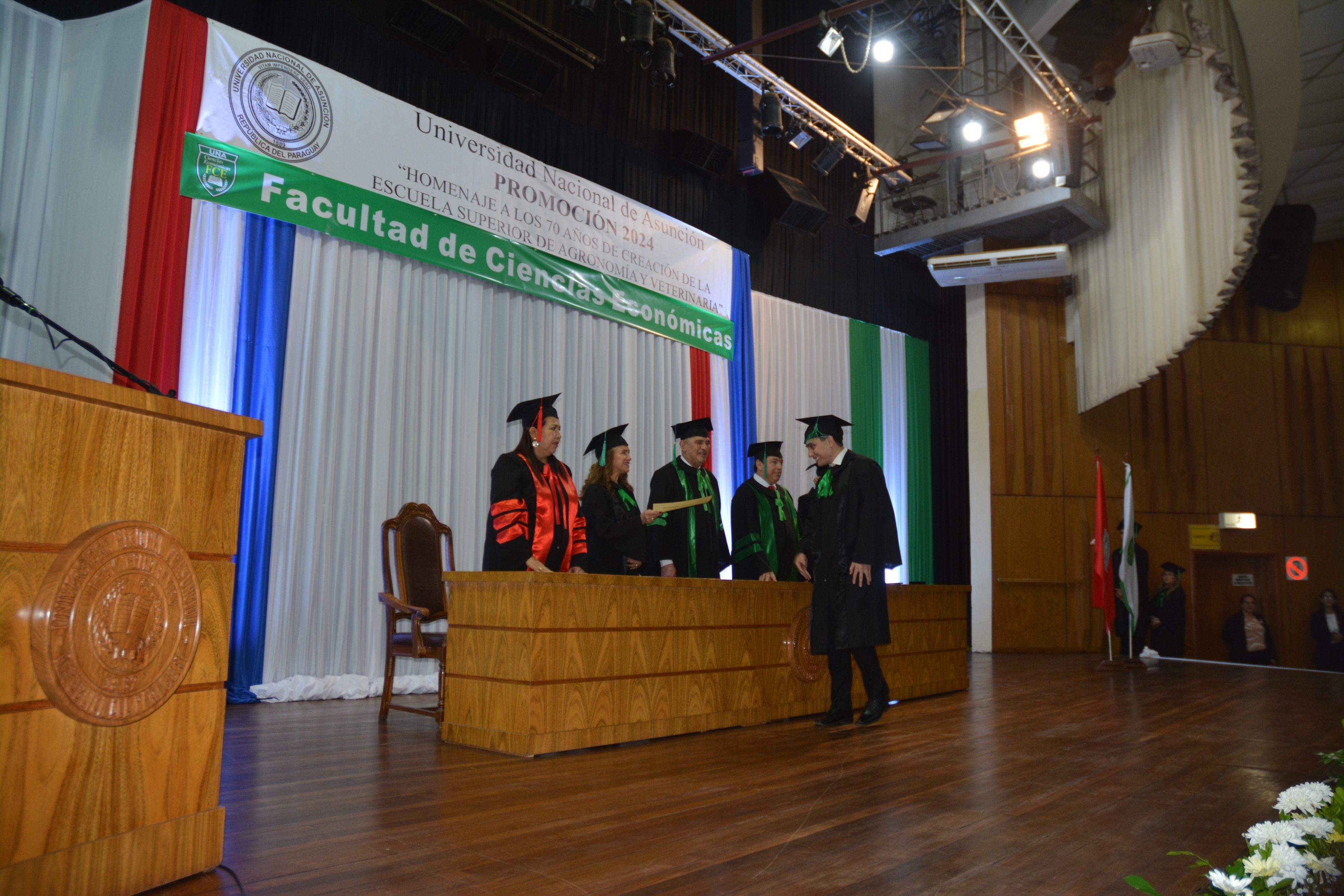 Profesionales de la carrera de Economía de la Facultad de Ciencias Económicas de la Universidad Nacional de Asunción (FCE-UNA) recibieron sus títulos de grado durante la ceremonia de colación realizada el 13 de octubre en el Centro de Convenciones de la UNA, en la ciudad de San Lorenzo.