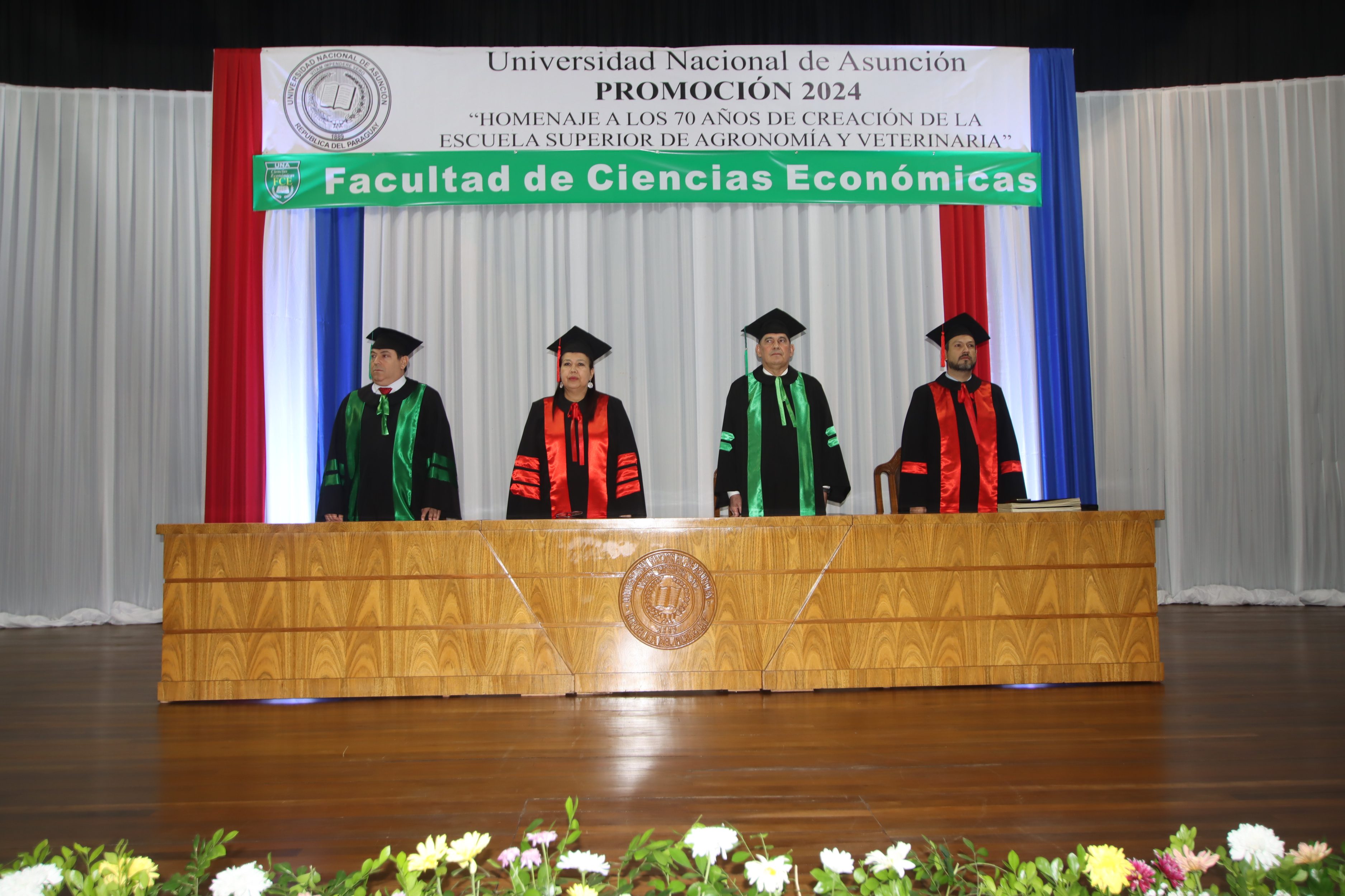 La mesa de honor de la promoción 2024, denominada “Homenaje a los 70 años de creación de la Escuela Superior de Agronomía y Veterinaria”, estuvo presidida por la Prof. Dra. Zully Vera de Molinas, rectora de la UNA; acompañada del Prof. Dr. Roberti Daniel González Martínez, decano de la FCE-UNA; el Prof. Mag. Derlis Daniel Lugo, vicedecano y el Ing. Quím. Cristian Cantero, secretario general de la UNA.