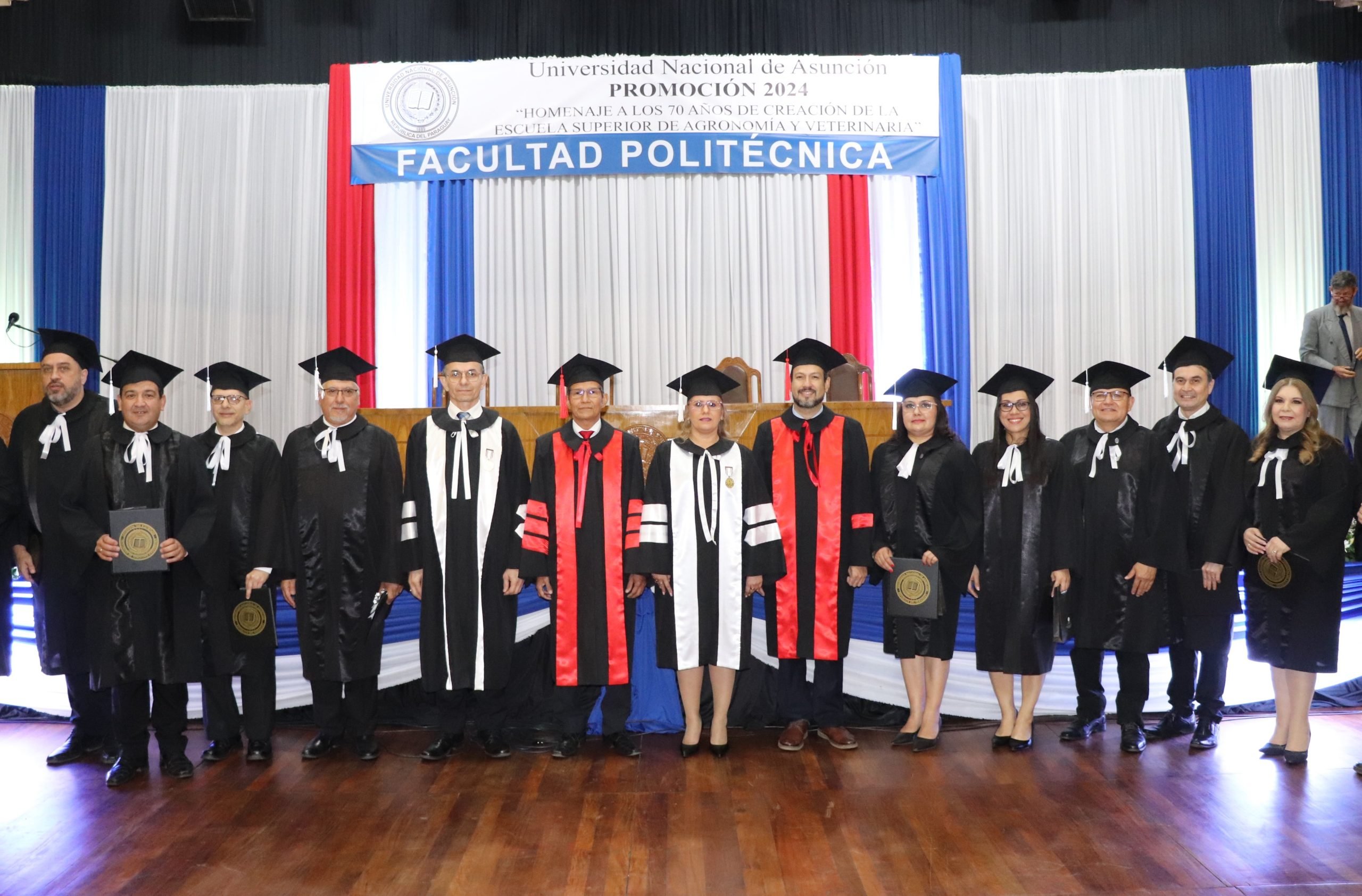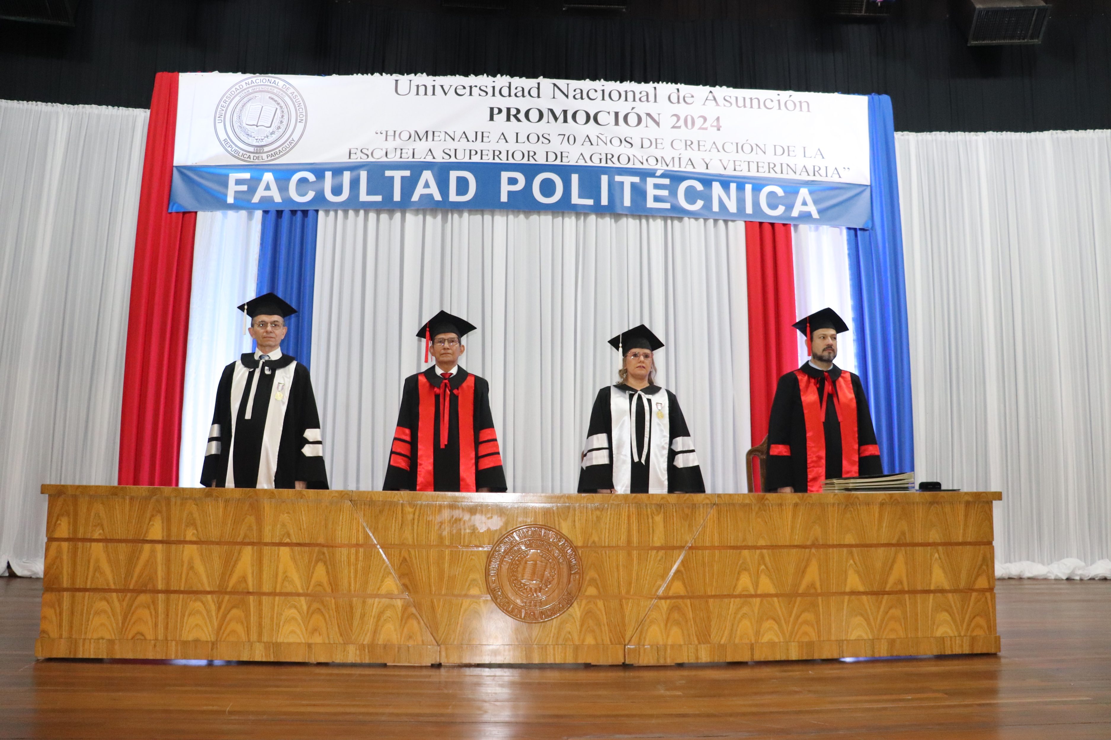 La mesa de honor de la promoción 2024, denominada “Homenaje a los 70 años de creación de la Escuela Superior de Agronomía y Veterinaria”, estuvo presidida por el Prof. Dr. Miguel Torres Ñumbay, vicerrector de la UNA; acompañado de la Prof. Ing. Silvia Teresa Leiva León, decana de la FP-UNA; el Prof. Mst. Claudio Nil Barúa Acosta, vicedecano; y el Ing. Quím. Cristian Cantero, secretario general de la UNA.