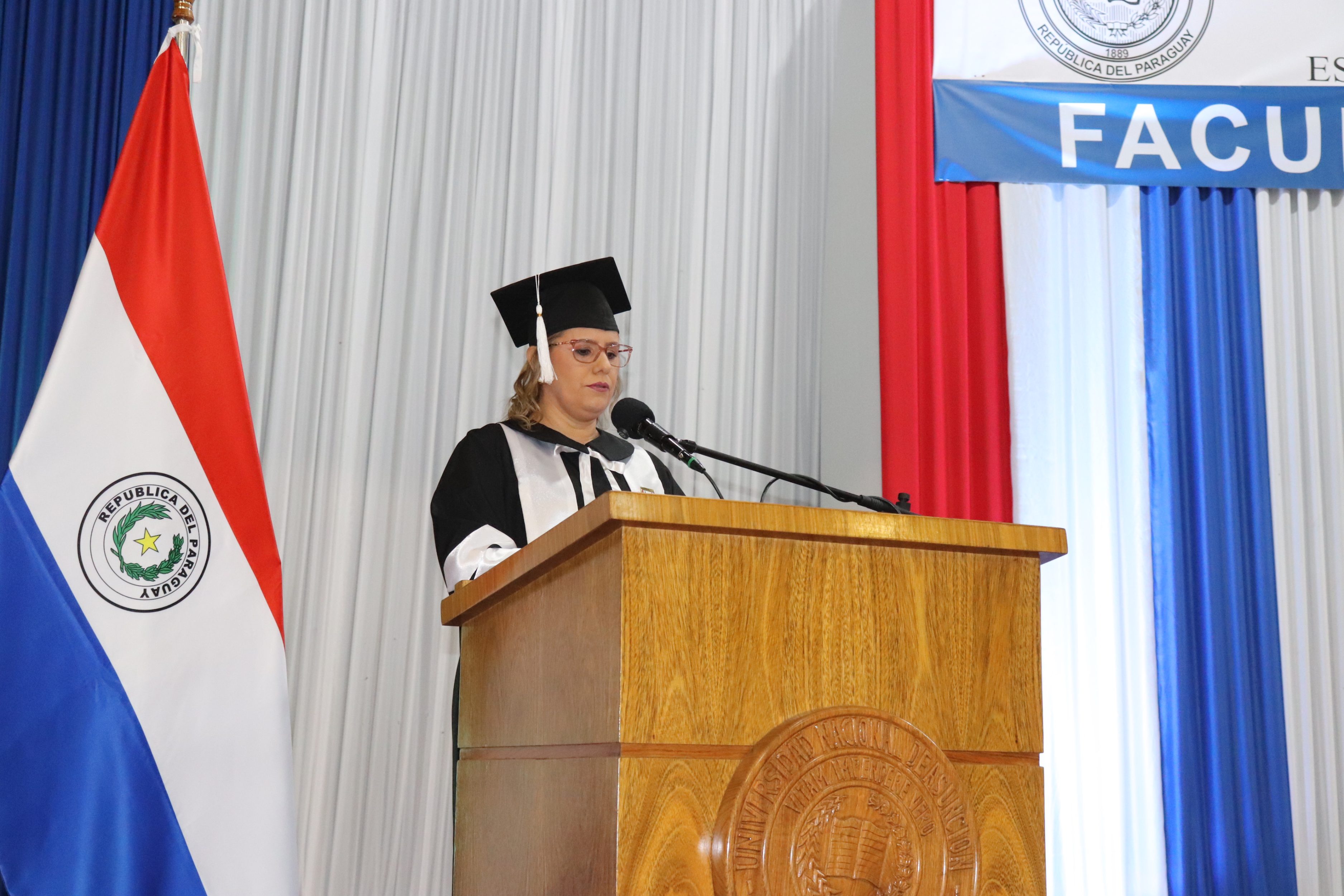 La decana indicó que en la graduación se ven los resultados del trabajo de la comunidad educativa y que la institución reafirma su compromiso de formar profesionales competentes, socialmente responsables y con compromiso con el desarrollo nacional sostenible. Más adelante, extendió sus congratulaciones a las familias de las egresadas y egresados, expresó gratitud a sus docentes y al personal administrativo por el compromiso asumido y como cierre instó a las egresadas y egresados a contribuir con la construcción de un país justo, solidario e innovador.