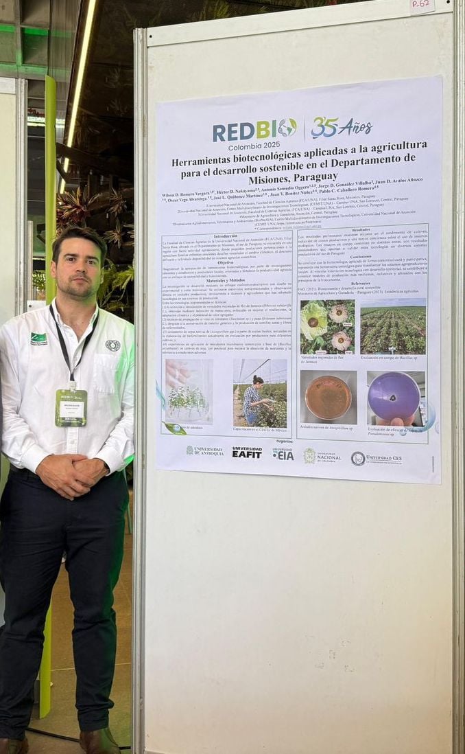 En el Encuentro REDBIO Internacional 2025, la delegación paraguaya en Medellín estuvo compuesta enteramente por profesionales de la UNA. El equipo estuvo compuesto, además del Dr. Nakayama, por el Prof. Dr. Jorge Daniel González Villalba, decano de la Facultad de Ciencias Agrarias (FCA-UNA), y contó con la participación del Prof. Ing. Agr. Juan Daniel Avalos Añazco (FCA-UNA Filial Santa Rosa Misiones), el Prof. Ing. Agr. Wilson Romero (Investigador de la FCA-UNA) y y el Ing. Agr. Antonio Samudio (CEMIT-UNA).