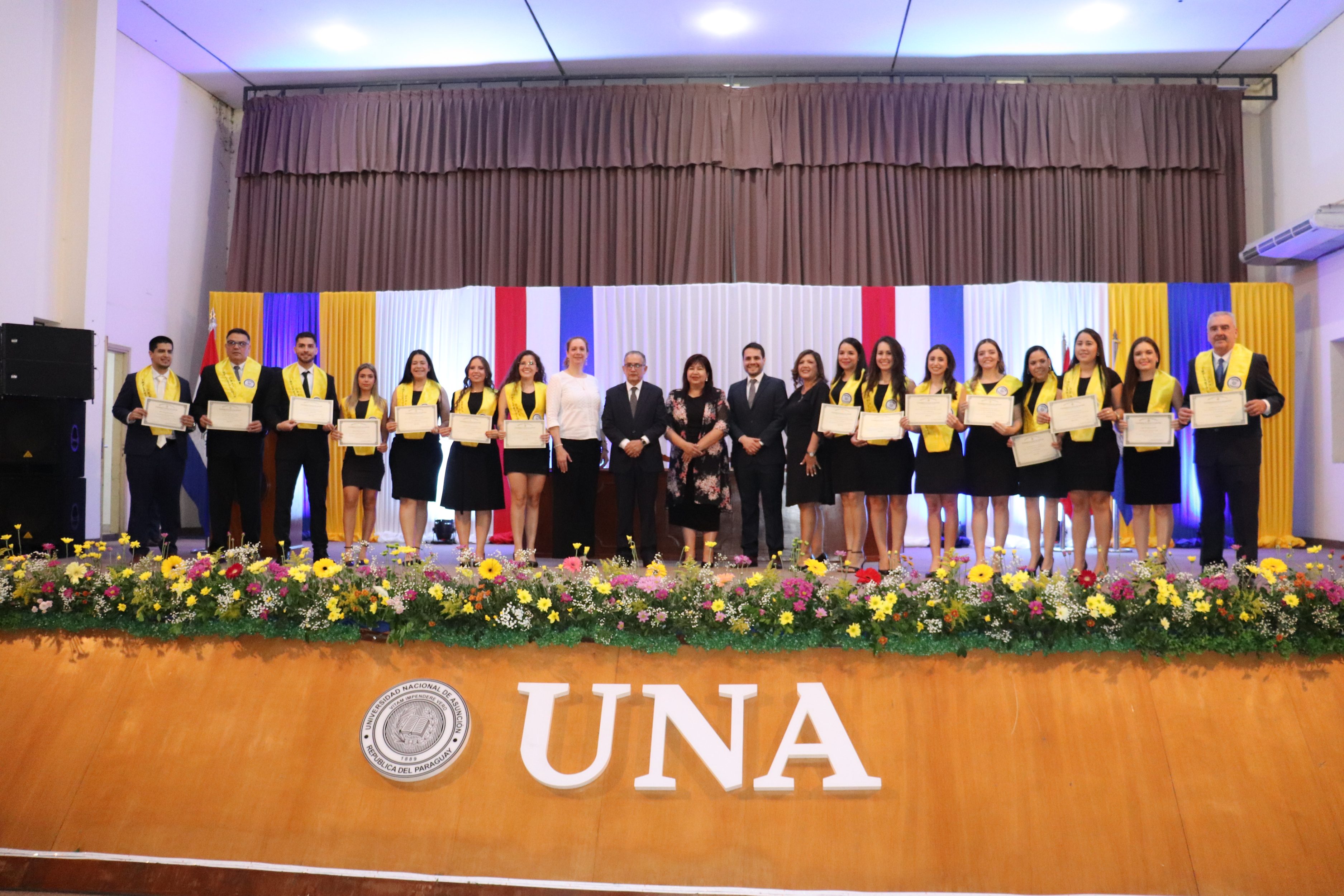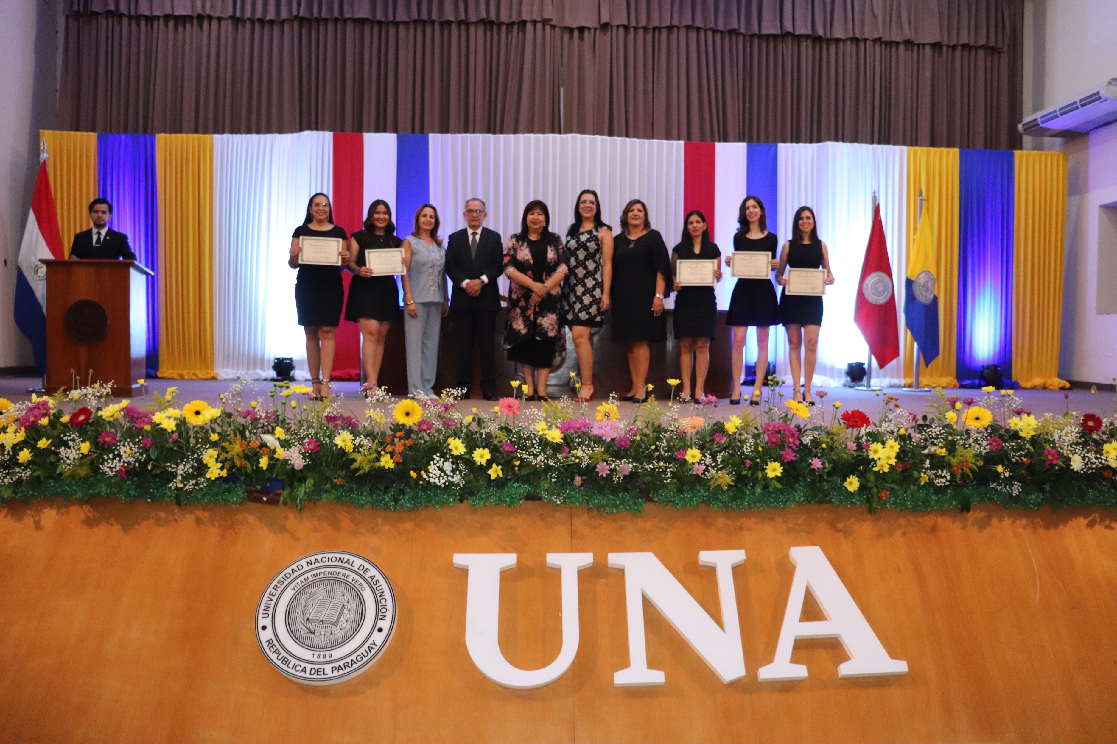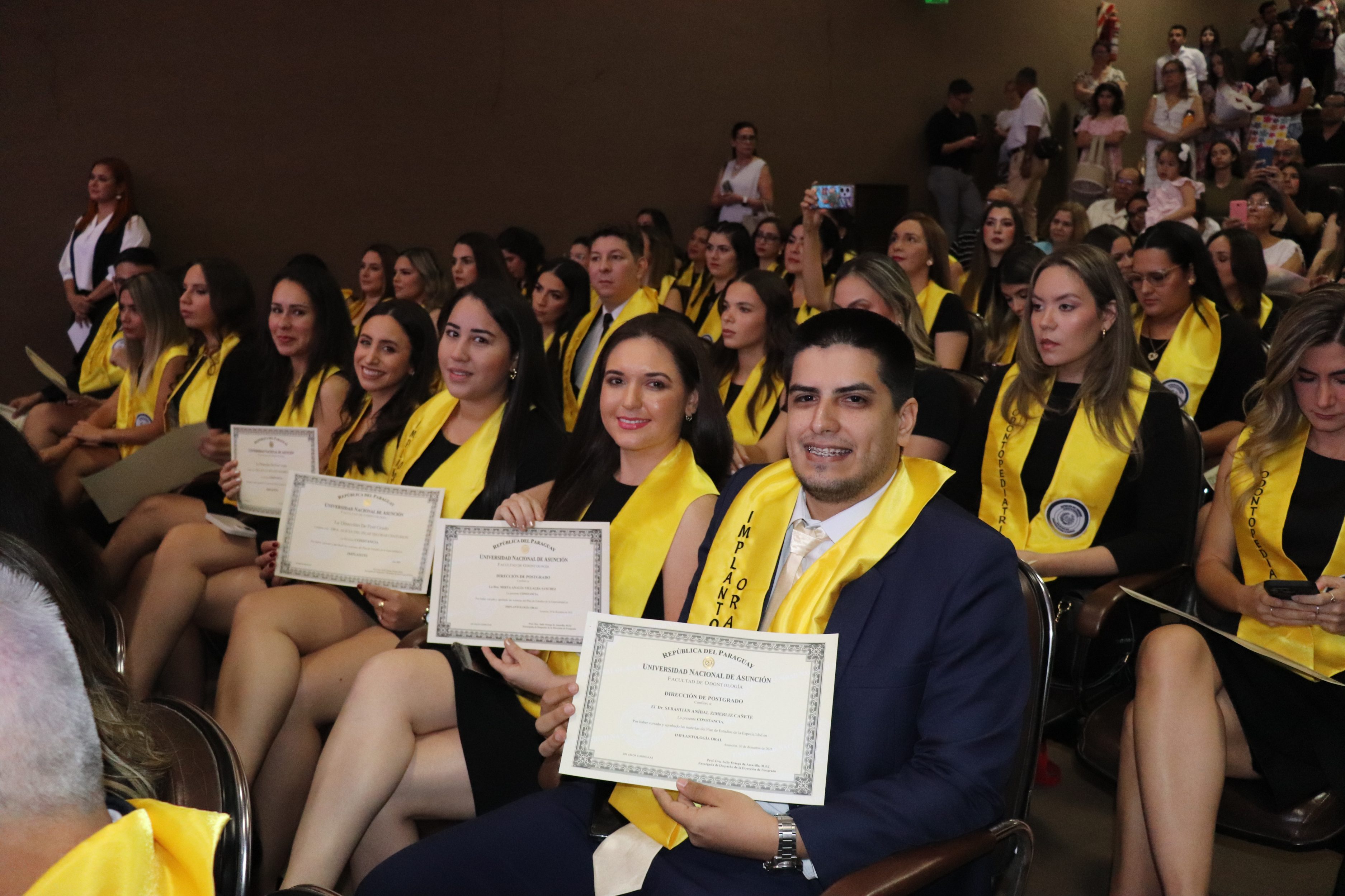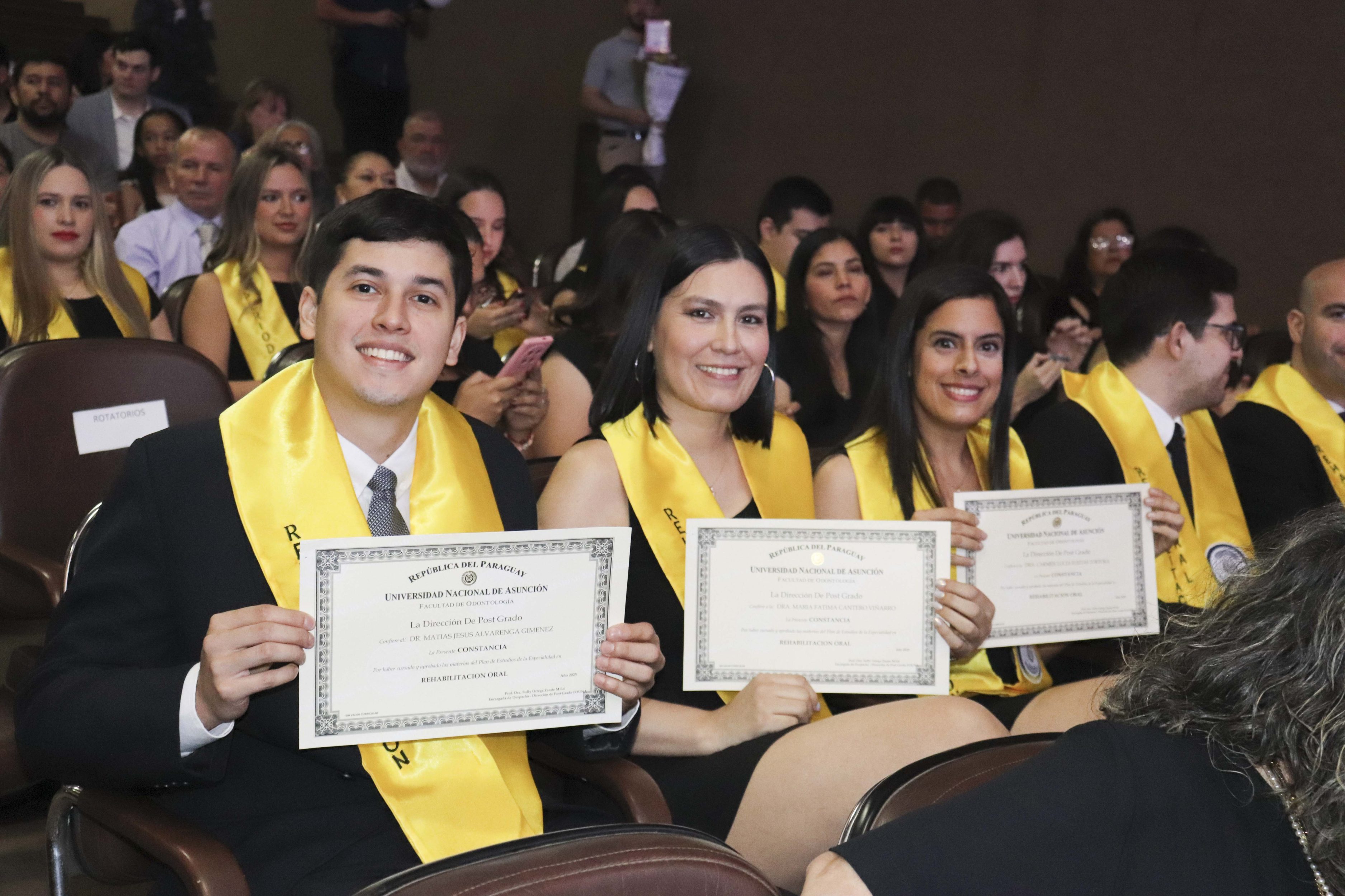Profesionales de la carrera de Odontología de la Universidad Nacional de Asunción (FOUNA) recibieron sus títulos de postgrado durante un acto llevado a cabo en el salón auditorio “Prof. Dr. Luis H. Berganza”, de la Dirección General de Extensión Universitaria (DGEU-UNA), el sábado 20 de diciembre.