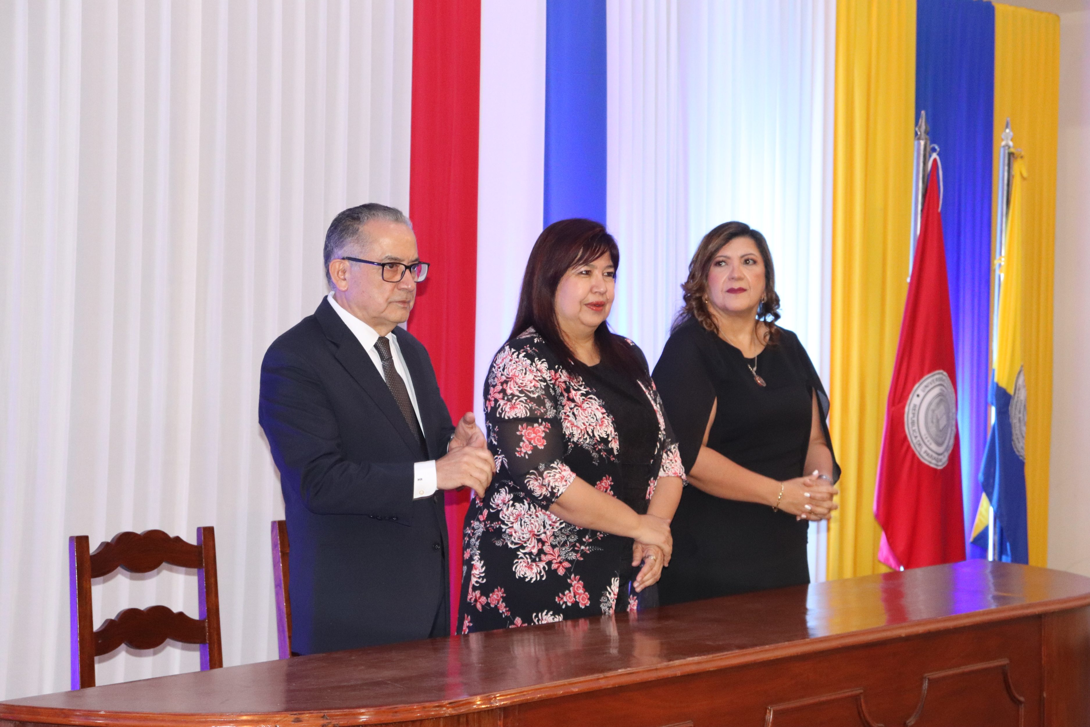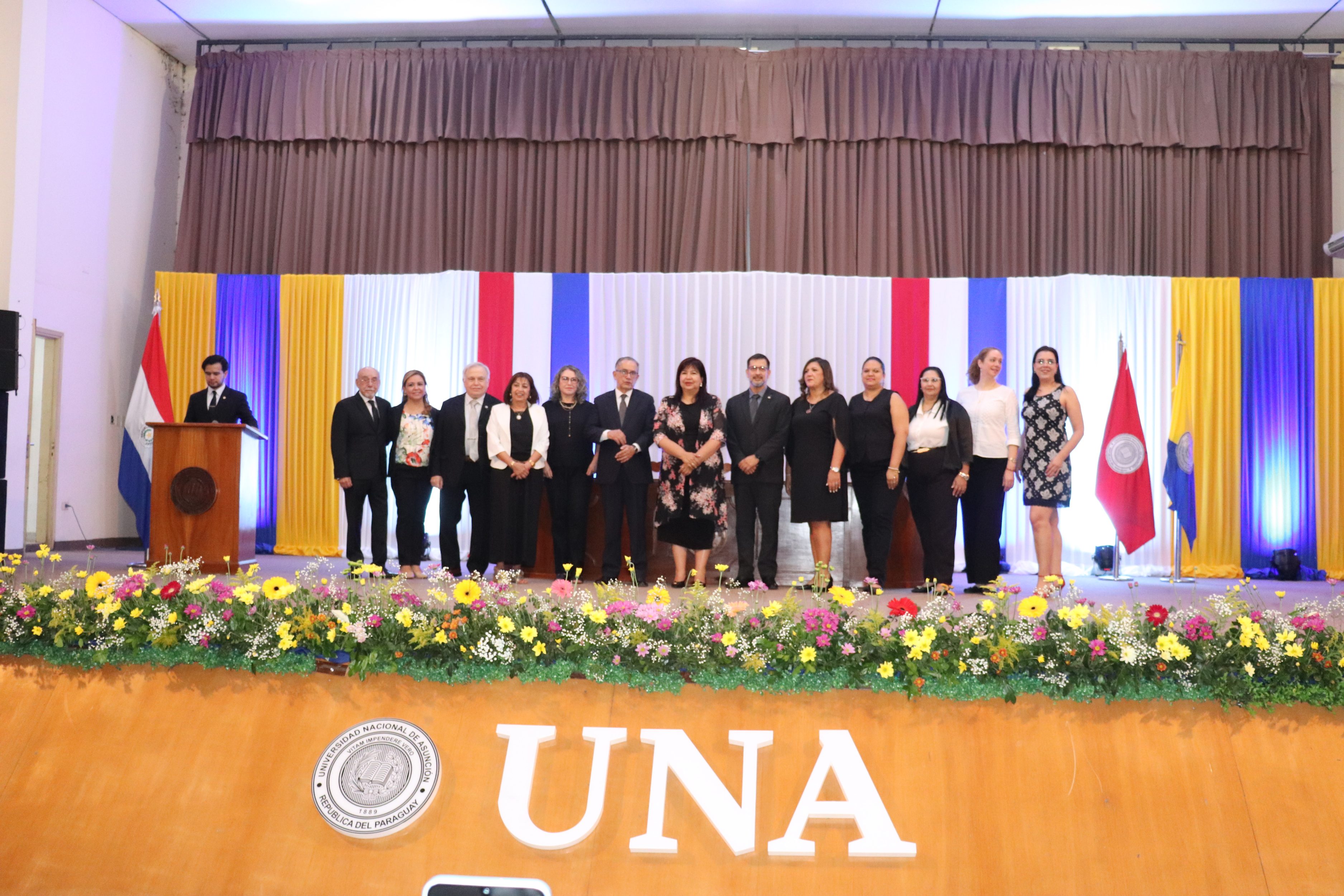 La mesa de honor estuvo presidida por la Prof. Dra. Zully Concepción Vera de Molinas, rectora de la UNA; el Prof. Dr. Rodolfo Perruchino Galeano, decano de la FOUNA; y la Prof. Dra. Sully Ortega Zárate, encargada de despacho de la Dirección de Postgrado de la facultad.