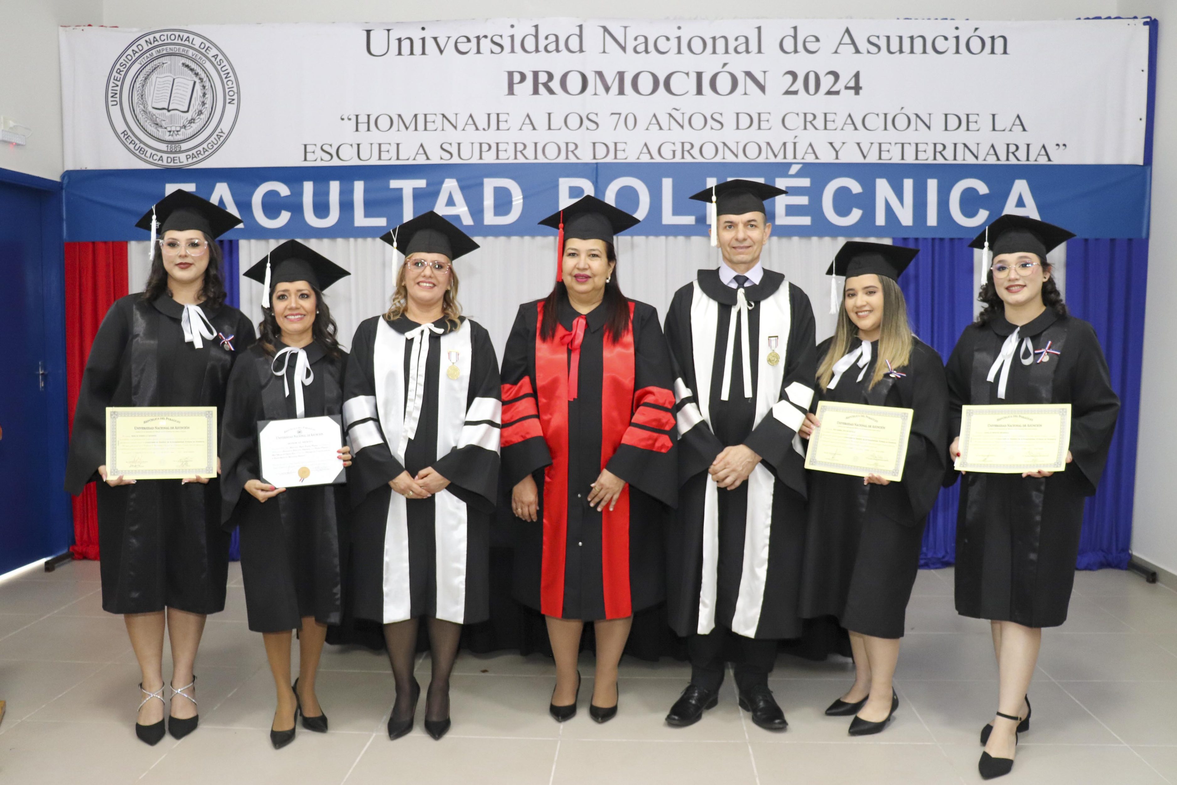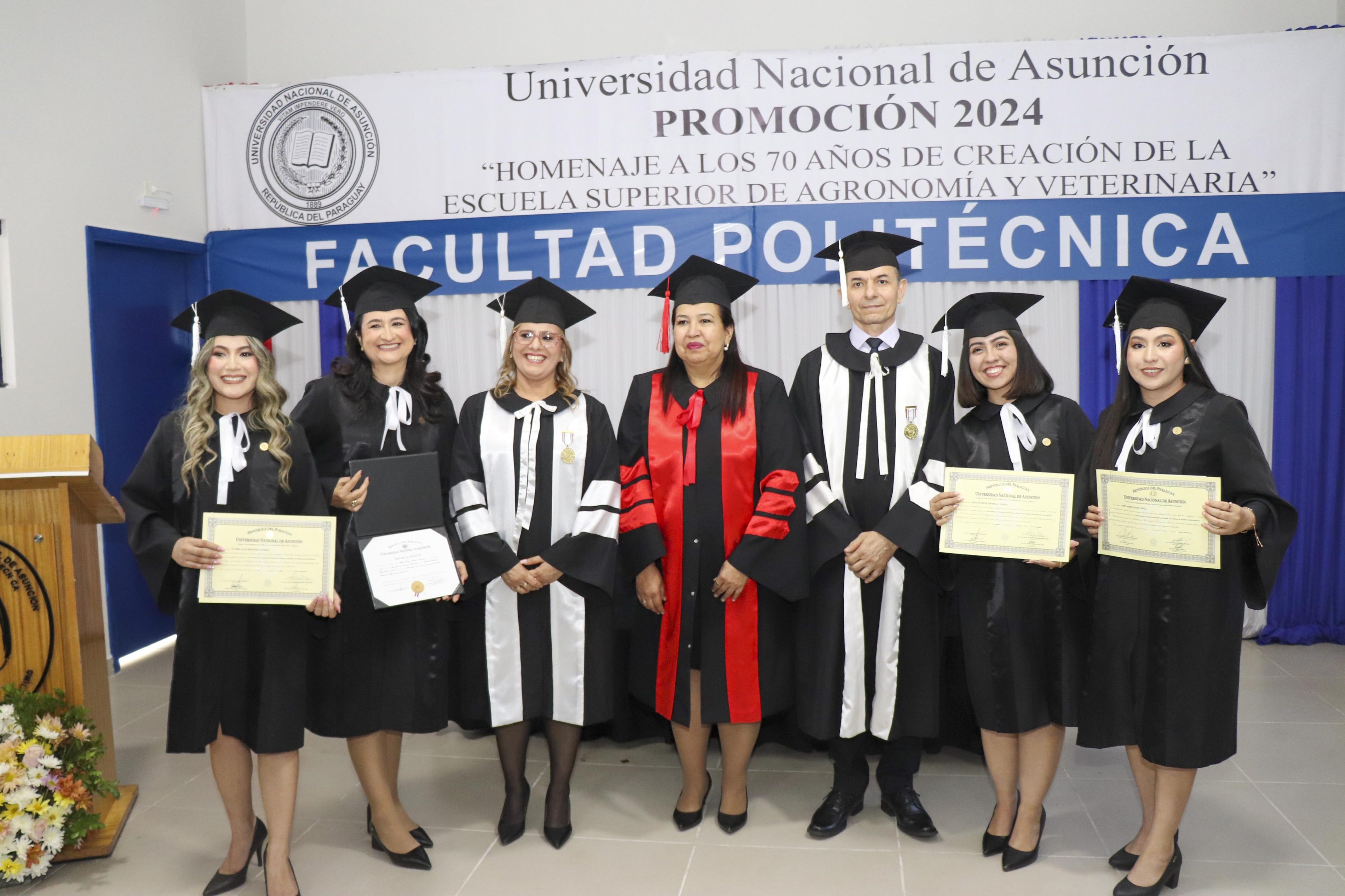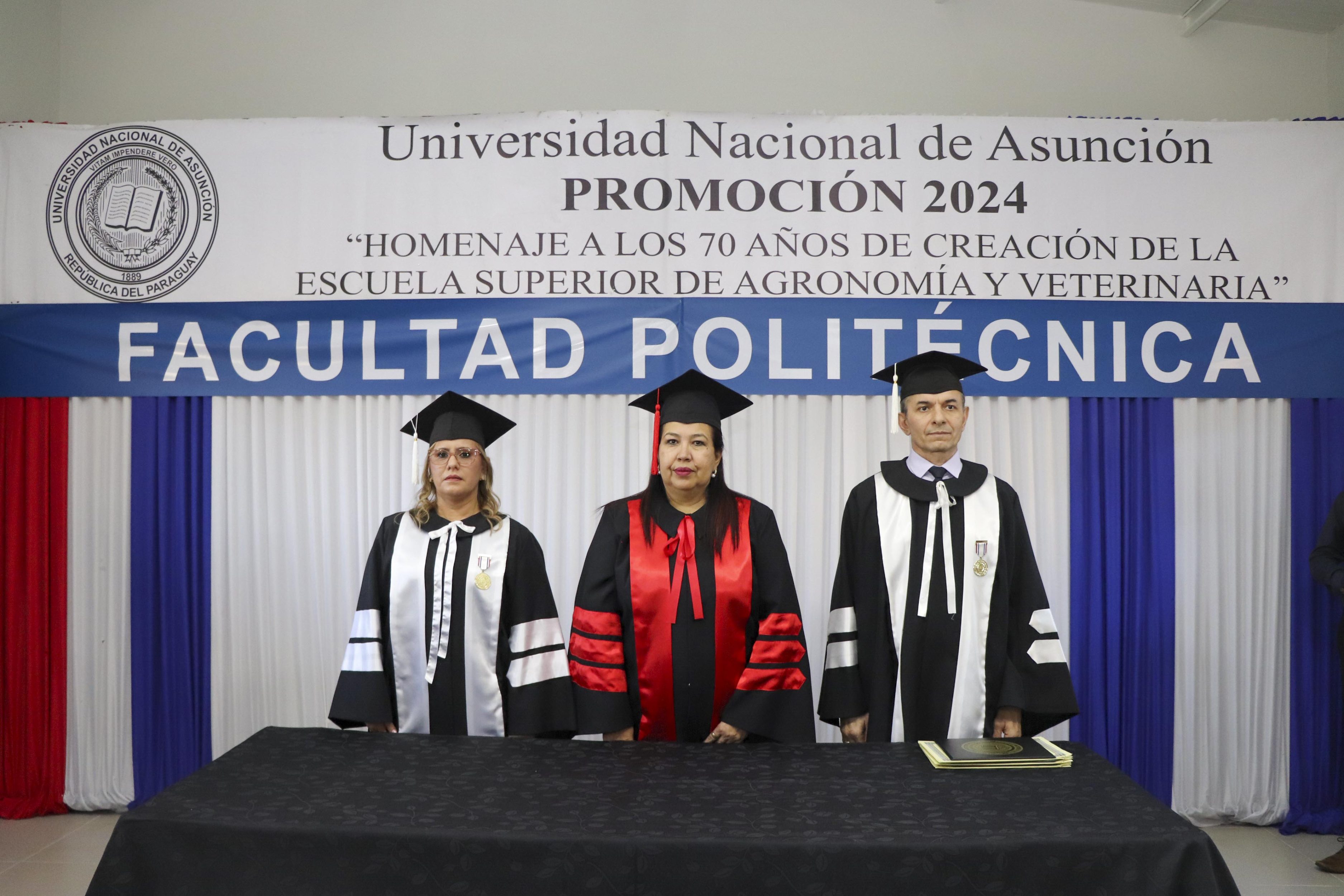 La mesa de honor de la promoción 2024, denominada “Homenaje a los 70 años de creación de la Escuela Superior de Agronomía y Veterinaria”, estuvo presidida por la Prof. Dra. Zully Vera de Molinas, rectora de la UNA; acompañada de la Prof. Ing. Silvia Teresa Leiva León, decana de la FP-UNA y el Prof. Mst. Claudio Nil Barúa Acosta, vicedecano.
