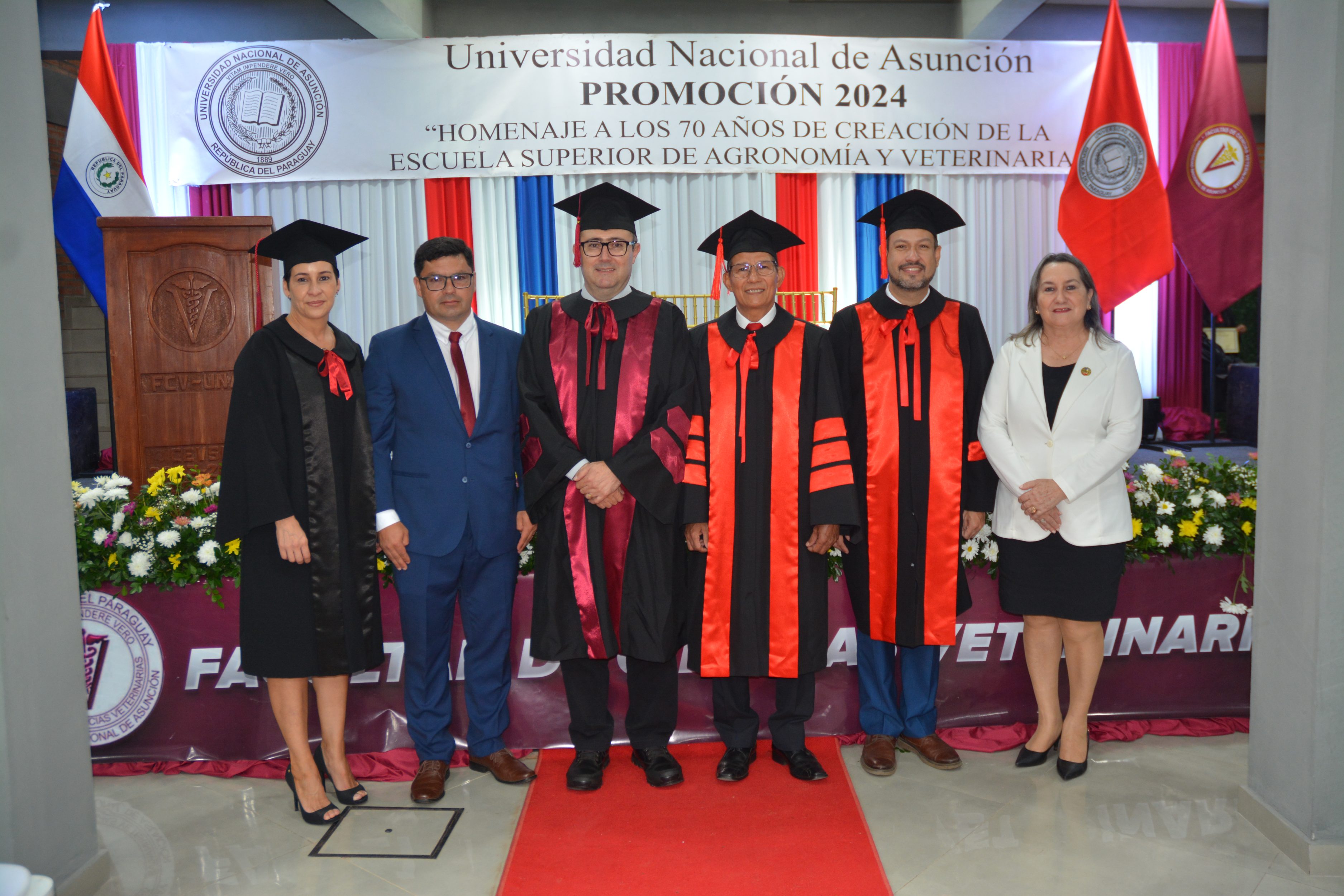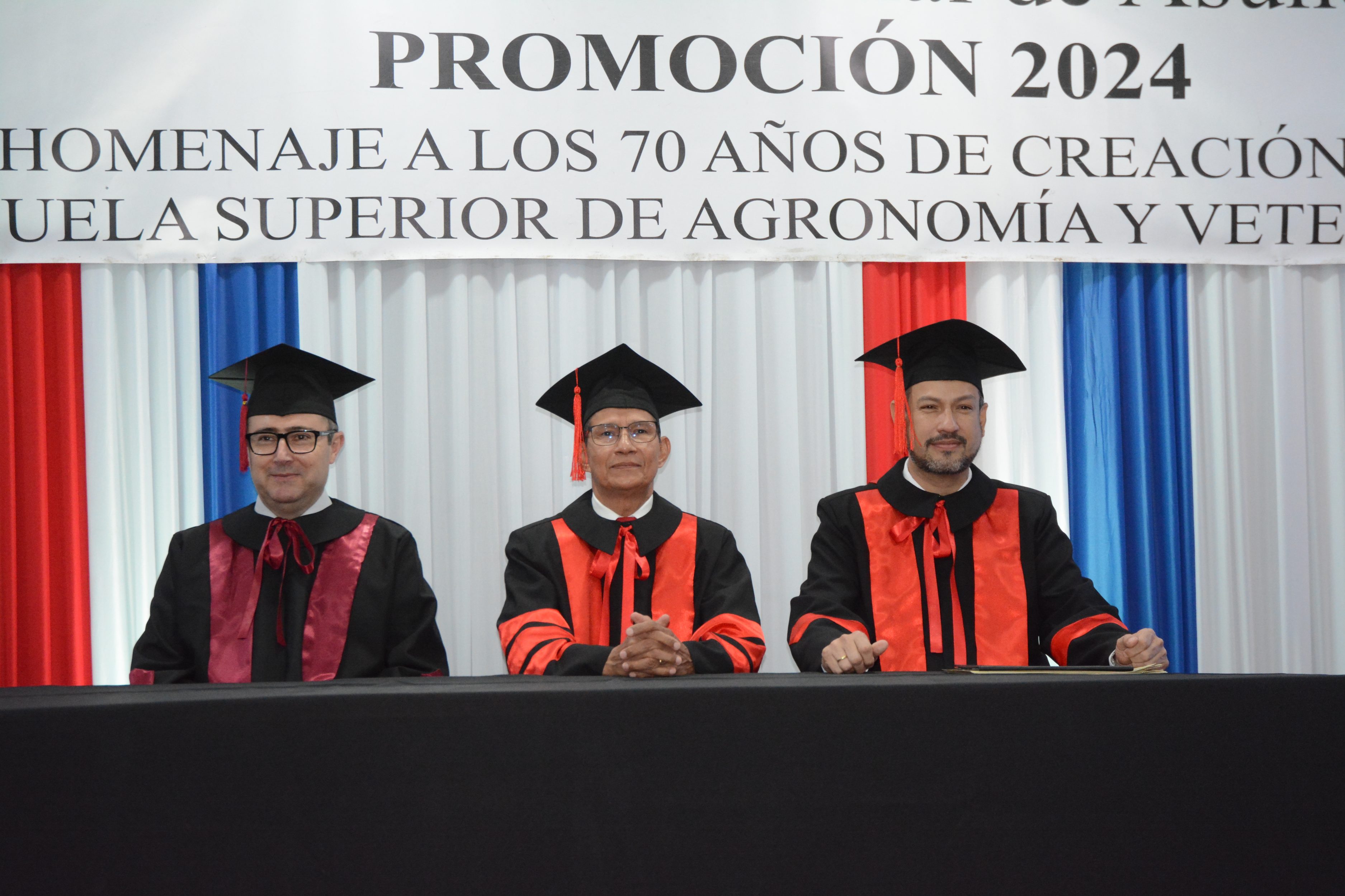 La mesa de honor de la promoción 2024, denominada “Homenaje a los 70 años de creación de la Escuela Superior de Agronomía y Veterinaria”, estuvo presidida por el Prof. Dr. Miguel Torres Ñumbay, vicerrector de la UNA, acompañado Prof. Dr. José Ramón Peralta, vicedecano de la facultad y el Ing. Quím. Cristian Cantero, secretario general de la UNA.