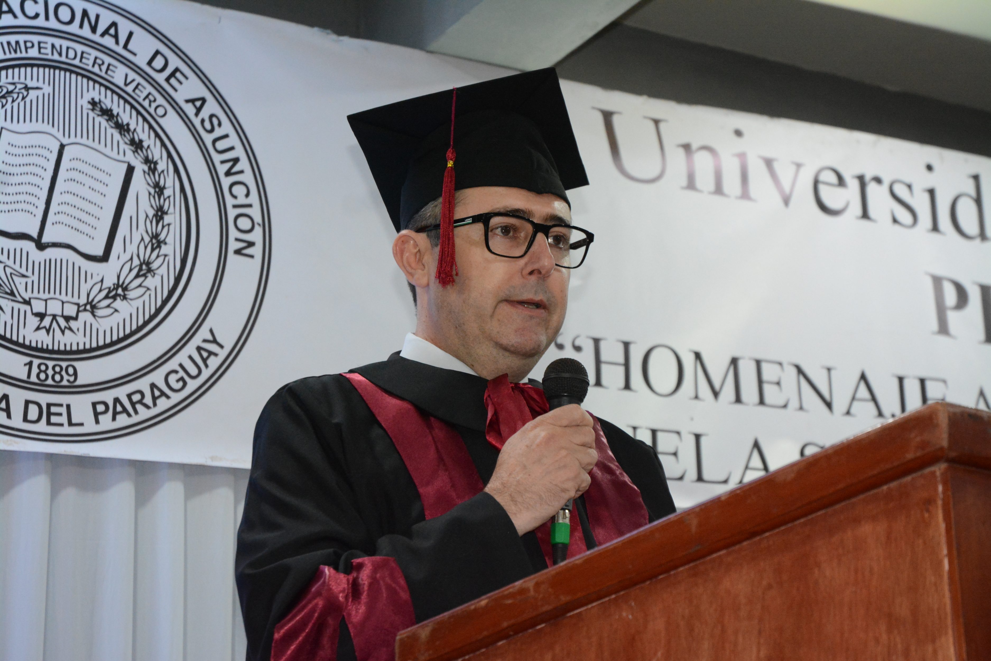 El vicedecano manifestó que es el inicio de una nueva etapa como profesionales y que el ejercicio del rubro es esencial para el aseguramiento de la salud y bienestar de las poblaciones y para el desarrollo de la comunidad. Más adelante, instó a las egresadas y egresados a que el compromiso del bienestar animal se extienda a lo largo de su ciclo de vida. Concluyó sus palabras con felicitaciones y agradecimientos, y les auguró a las nuevas y nuevos profesionales un futuro prometedor.