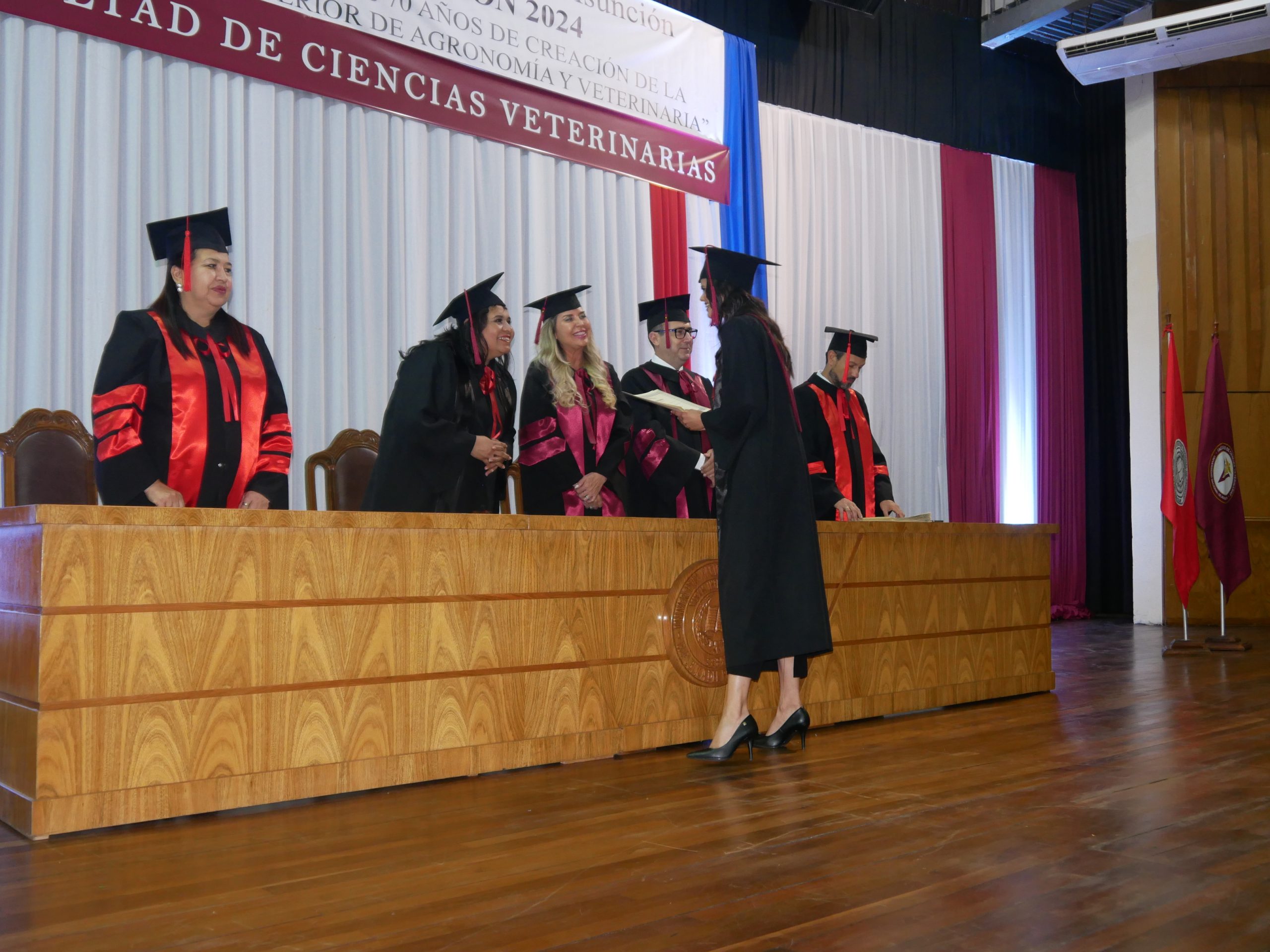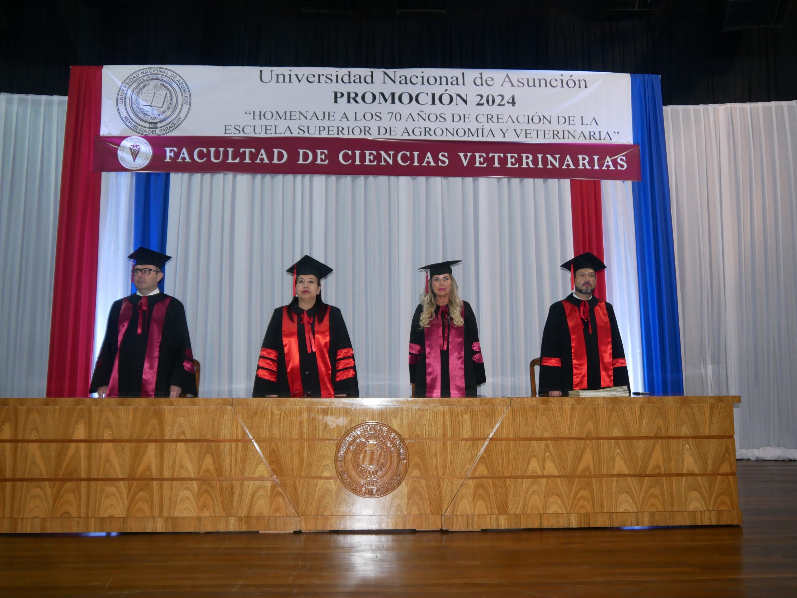 La mesa de honor de la promoción 2024, denominada “Homenaje a los 70 años de creación de la Escuela Superior de Agronomía y Veterinaria”, estuvo presidida por la Prof. Dra. Zully Vera de Molinas, rectora de la UNA; acompañada de la Prof. Dra. Viviana María Ríos Morínigo, decana de la FCV-UNA; el Prof. Dr. José Ramón Peralta, vicedecano y el Ing. Quím. Cristian Cantero, secretario general de la UNA.