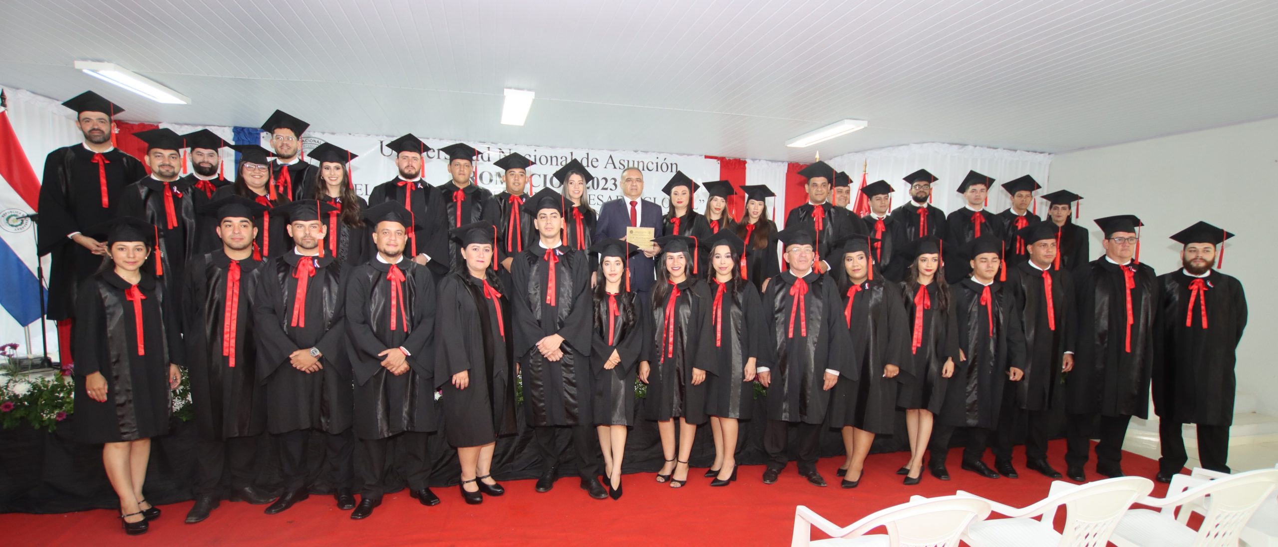 Profesionales de la carrera de Derecho, de la Facultad de Derecho y Ciencias Sociales de la Universidad Nacional de Asunción (FDCS-UNA), filial San Pedro del Ycuamandyyú, recibieron sus títulos de grado durante una ceremonia de colación que se celebró el 17 de octubre en la sede sampedrana.