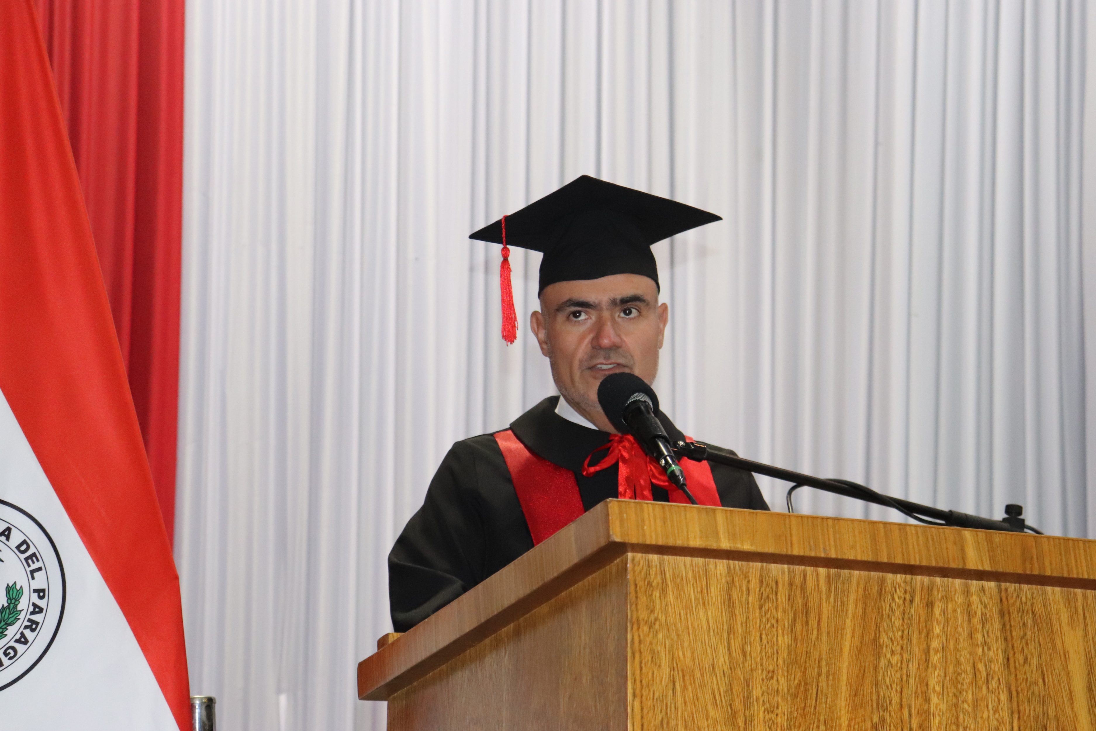 El decano se refirió a los inicios históricos de la facultad, destacó al Prof. Dr. Cecilio Báez, primer director de la Escuela de Notariado. Hizo hincapié al trabajo que desarrolla el notario, que “no es un mero tramitador, es el profesional del derecho encargado de una función pública”. Les recordó a las y los profesionales que serán custodios de la fe pública y les instó a continuar sus estudios de postgrado.