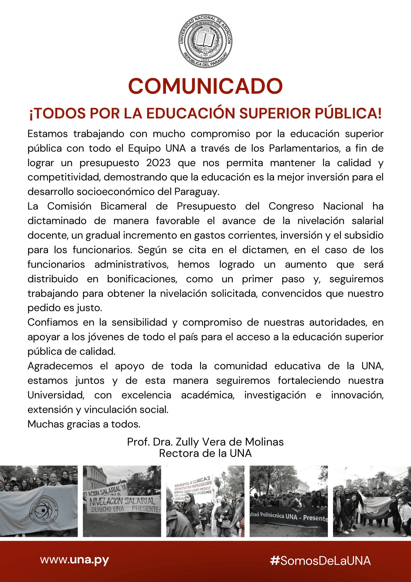 Estamos trabajando con mucho compromiso por la educación superior pública con todo el Equipo UNA a través de los Parlamentarios, a fin de lograr un presupuesto 2023 que nos permita mantener la calidad y competitividad, demostrando que la educación es la mejor inversión para el desarrollo socioeconómico del Paraguay.