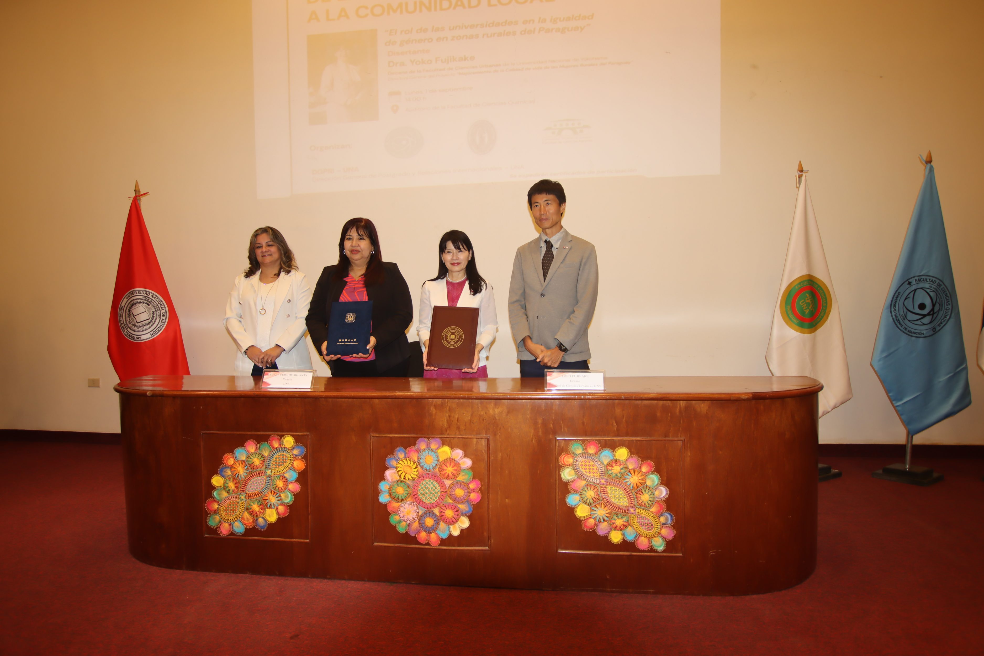 En el marco del mes aniversario de la Universidad Nacional de Asunción (UNA), se llevó a cabo un encuentro que reunió a autoridades universitarias y representantes del Rectorado, de la Facultad de Ciencias Químicas (FCQ-UNA), de la Facultad de Ciencias Agrarias (FCA-UNA), de la Facultad Politécnica (FP-UNA) y de la Universidad Nacional de Yokohama (YNU, por sus siglas en inglés), de Japón. La actividad, realizada el lunes 1 de septiembre en el auditorio de la FCQ-UNA, incluyó la renovación de un acuerdo de movilidad estudiantil y un simposio sobre el papel de las universidades en la vida de mujeres rurales de nuestro país.